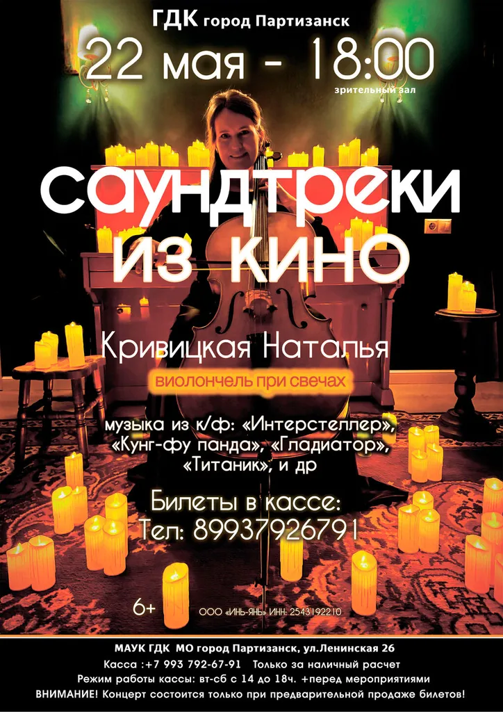 На сцене МАУК ГДК МО город Партизанск популярные саундтреки в живом звучании виолончели и мерцании свечей от лауреата международных конкурсов Натальи Кривицкой (виолончель).